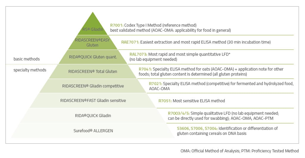 Oltre al nostro kit RIDASCREEN® Gliadin, che segue il Metodo Tipo I del Codex Alimentarius, tutti gli altri saggi immunologici, comprese le strip rapide per il glutine, si basano sull’anticorpo R5. Di conseguenza, il modello di reattività immunologica è simile e i risultati sono comparabili, garantendo la tracciabilità rispetto al metodo Codex. Ciò assicura risultati coerenti lungo l’intera filiera alimentare (dai fornitori di cereali fino alla produzione del prodotto finale) e permette di adattare l’analisi a specifiche esigenze, come rapidità, semplicità o particolarità dei prodotti alimentari.