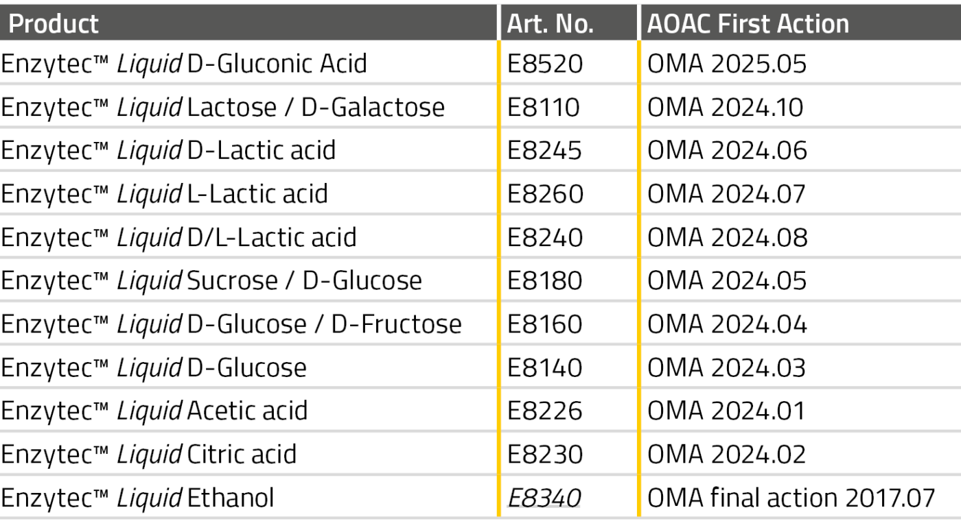 Enzytec™ Liquid Ethanol: Recognized as the AOAC-Official Method of Analysis (2017.07) and recommended by theo Codex Alimentarius Method (Type IV).